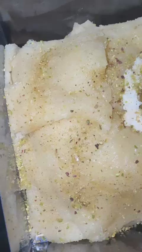 1kg of Fresh home made soft sweet cheese dough topped with ashta (clotted cream) crushed pistachio and rose water sugar syrup